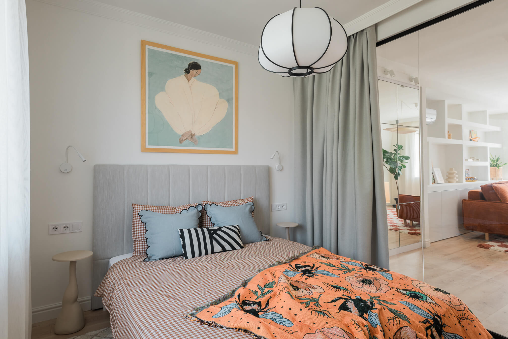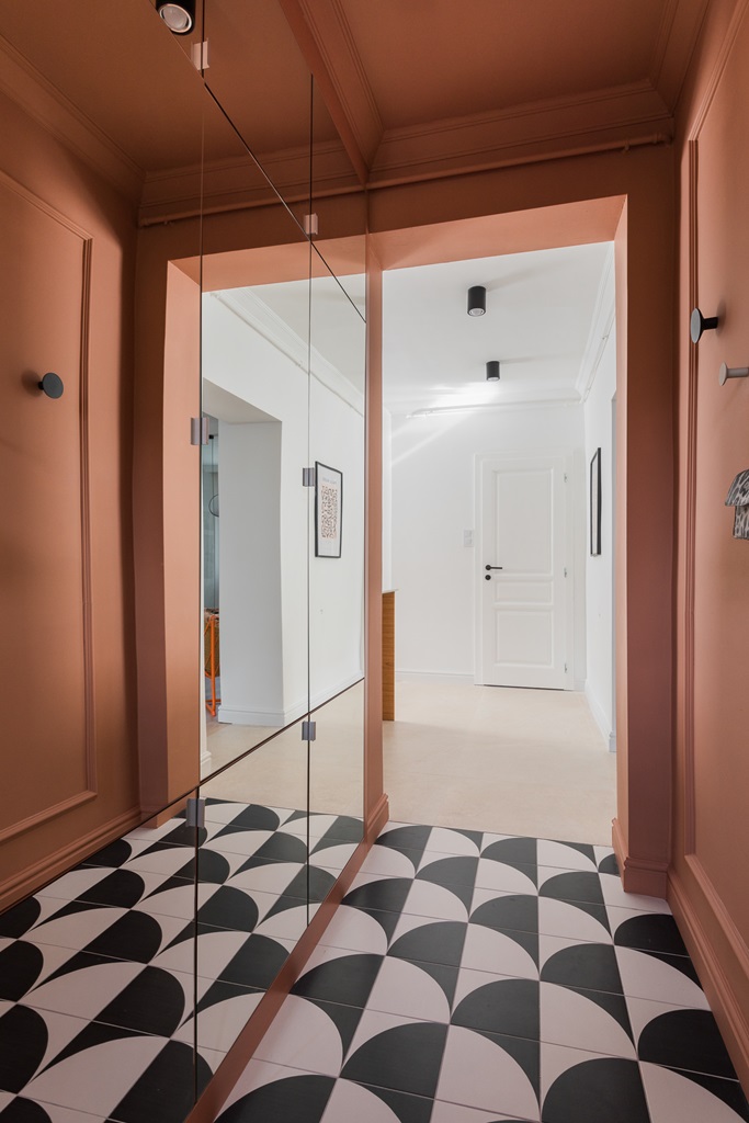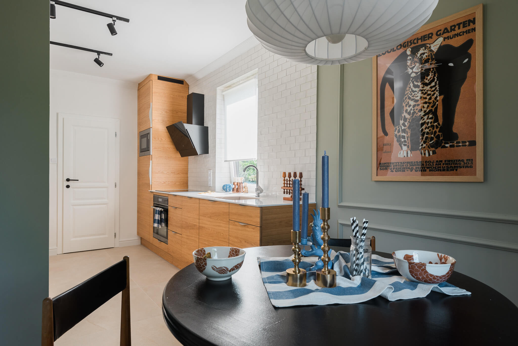 A változatos, mégis egységes összképért a gondosan választott, ámde merészen használt falszínek és a kontrasztos járólapok felelnek, a fali lécezés pedig finoman hozza be a színforgatagba a megnyugtató klasszikus eleganciát. A konyhaszekrény anyagait nem csak nézni, de tapintani is kellemes érzés. A nappali és a hálószoba textúrái puhák, a pasztell árnyalatokat itt-ott felpezsdíti egy-egy élénk szín. Az egész lakás eklektikájára jellemző a régi mondás: az ellentétek vonzzák egymást.