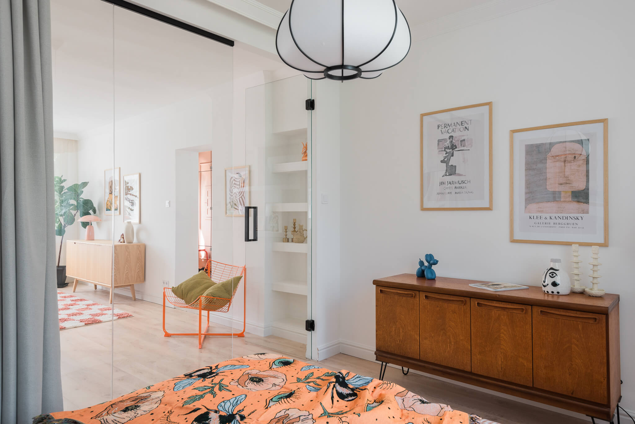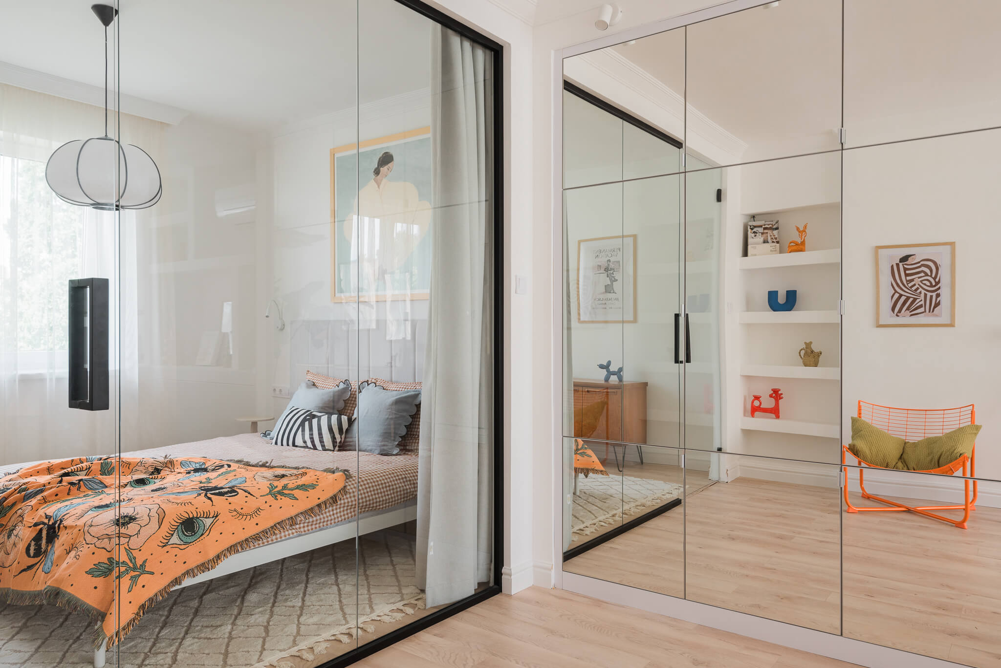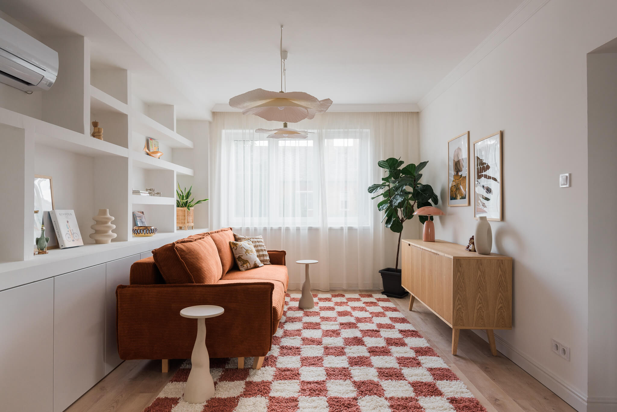 Első felmérésünkkor a kis társasház első emeletén elhelyezkedő ingatlan viszonylag jellegtelennek tűnt, de jó fényviszonyokkal rendelkezett, éppen a belső bontásokat kezdték el. Volt még lehetőség további közfalakat is bontani vagy építeni, így újragondoltuk a helyiségek funkcióját és méretét. Szerettük volna kiragadni a kis lakást az eredeti, kissé morózus, dobozszerű elrendezéséből, és minél tágasabb, fényesebb tereket elérni. Ezért a konyhát az étkezővel vontuk egy térbe, míg a hálószobát egy elfüggönyözhető üvegfallal választottuk le a nappaliról. Így, a több ablakból bejutó természetes fénynek köszönhetően sokkal nagyvonalúbbá és jobb hangulatúvá vált a lakás.