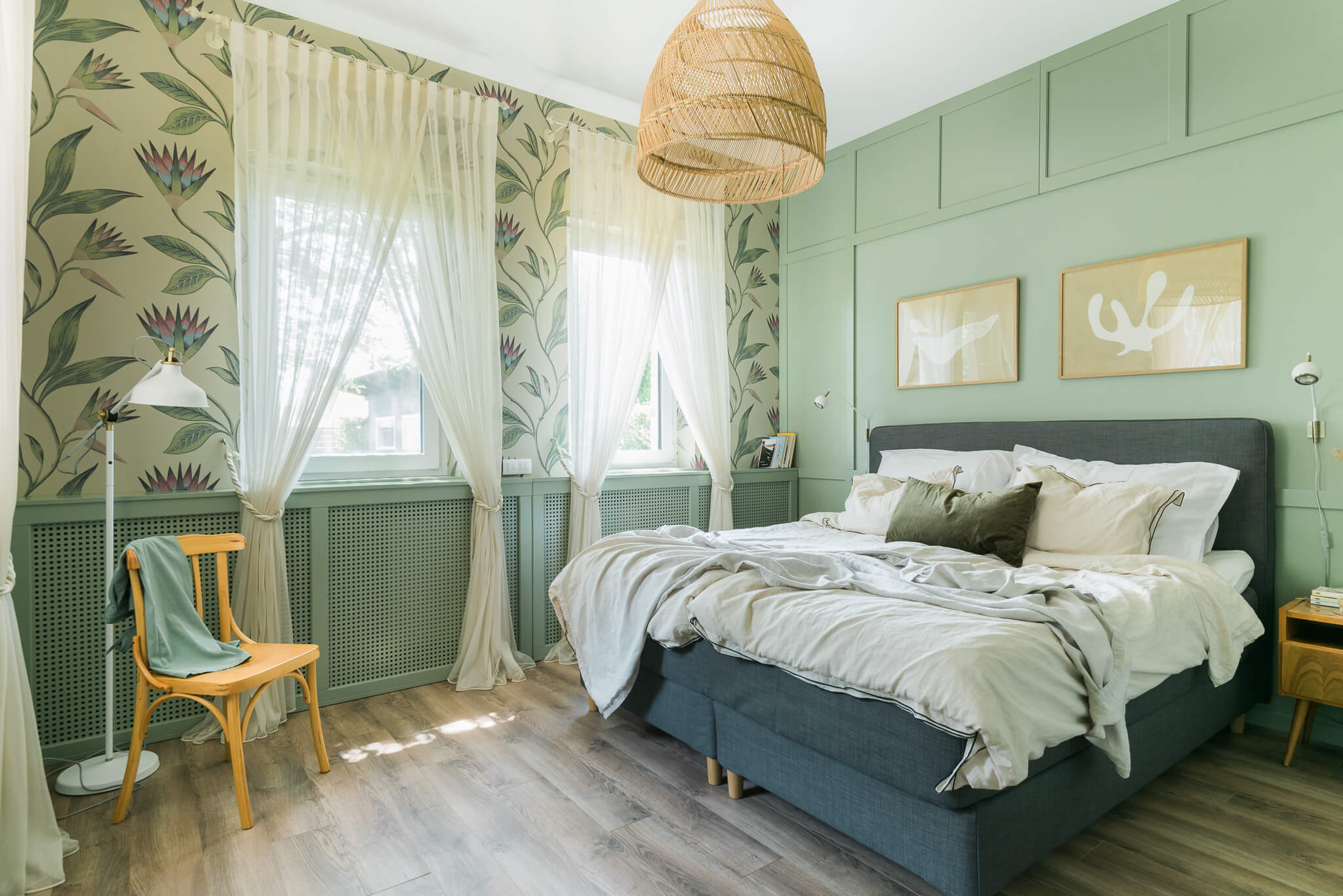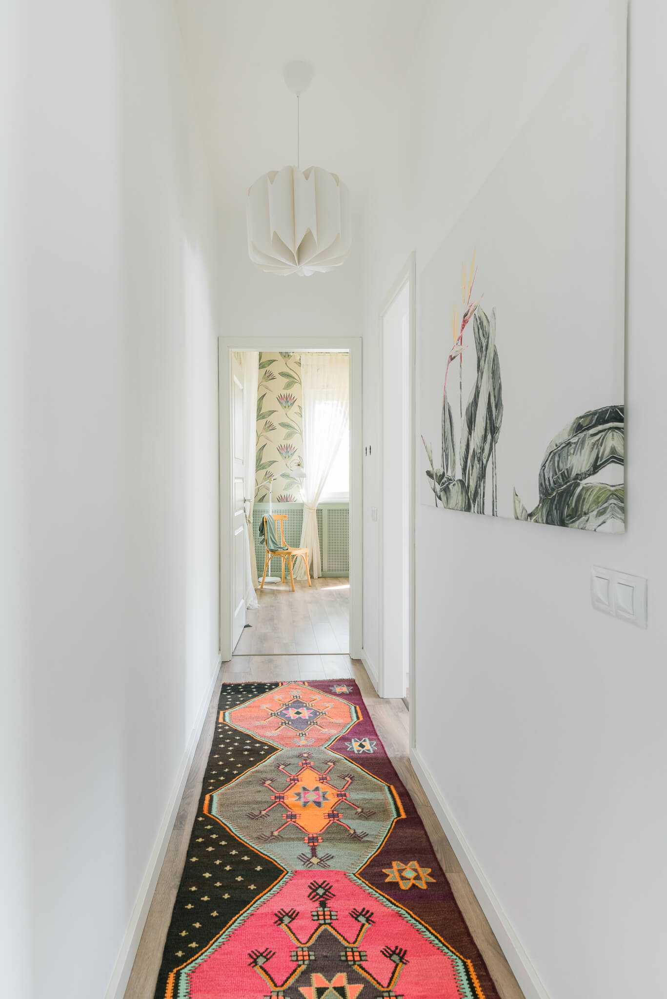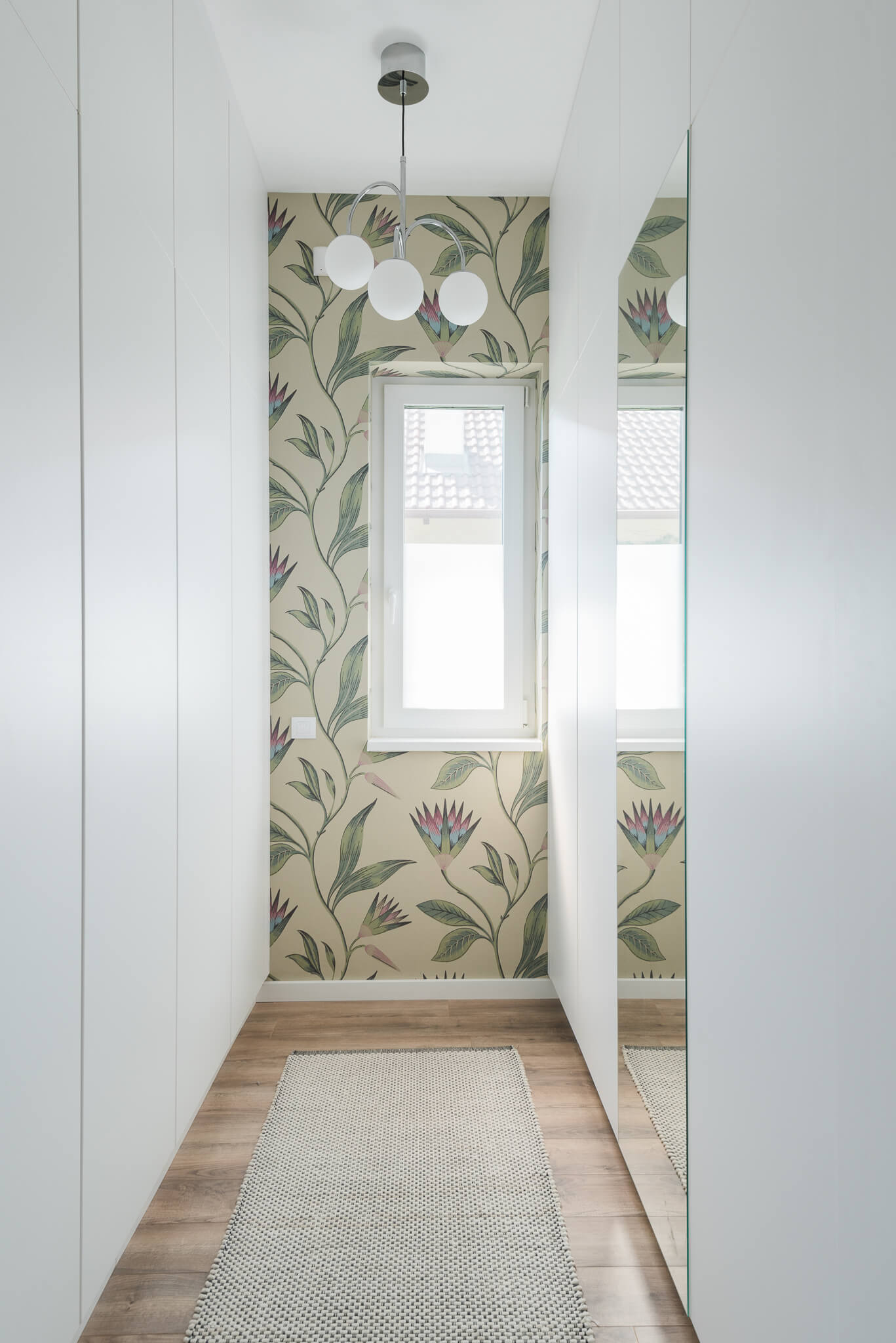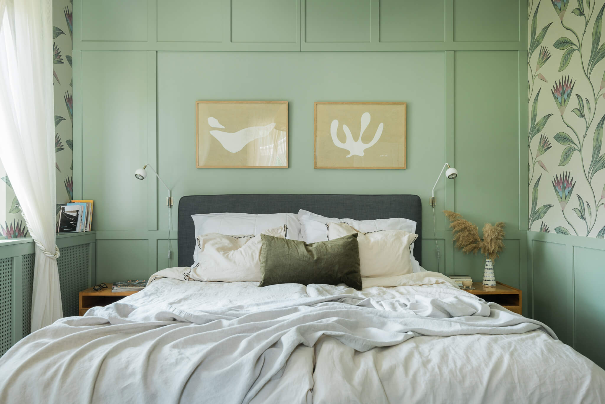 Nagyon jól példázza ez az elkészült beltér a saját berendezési elveinket is. Ugyanúgy megtalálható a lakásban a nagymamától örökölt kedves bútordarab, az egyszerű natúrfa polcrendszer, a használtan beszerzett dizájnlámpa, az egyedi fémvázzal kiegészített ikeás médiaszekrény, ahogyan a norvég kandalló, tükörfrontos beépített szekrény vagy a dizájntapéta, sőt egy nadrág színéhez hangolt teljes hálószobai falipanelezés is!